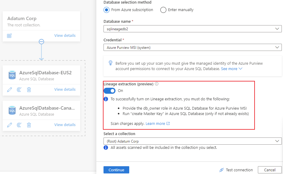 Microsoft Purview supports lineage for views and stored procedures from Azure SQL Database. While lineage for views is supported as part of scanning, you'll need to turn on the Lineage extraction toggle to extract stored procedure lineage when you're setting up a scan.