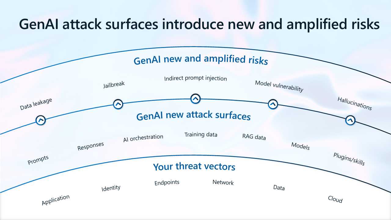 - GenAI introduces new amplified risks, including data leakage, jailbreak (compromising devices that are otherwise secured), indirect prompt injection, and model vulnerability.