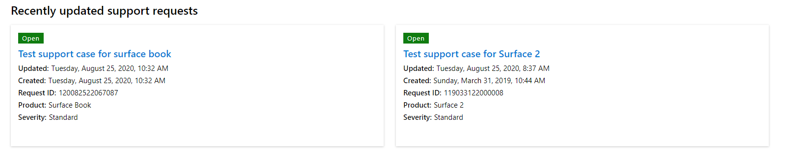 See the most recent support activity against your support cases at a glance. Users that have appropriate permissions may view a list of their own recently updated support requests, or support requests that have been shared with them. Additionally, users with the “View all Support cases” permission would see a list of any recently updated support requests that have been consented for in the Cloud Support Request Visibility page and that are assigned to the current Workspace.