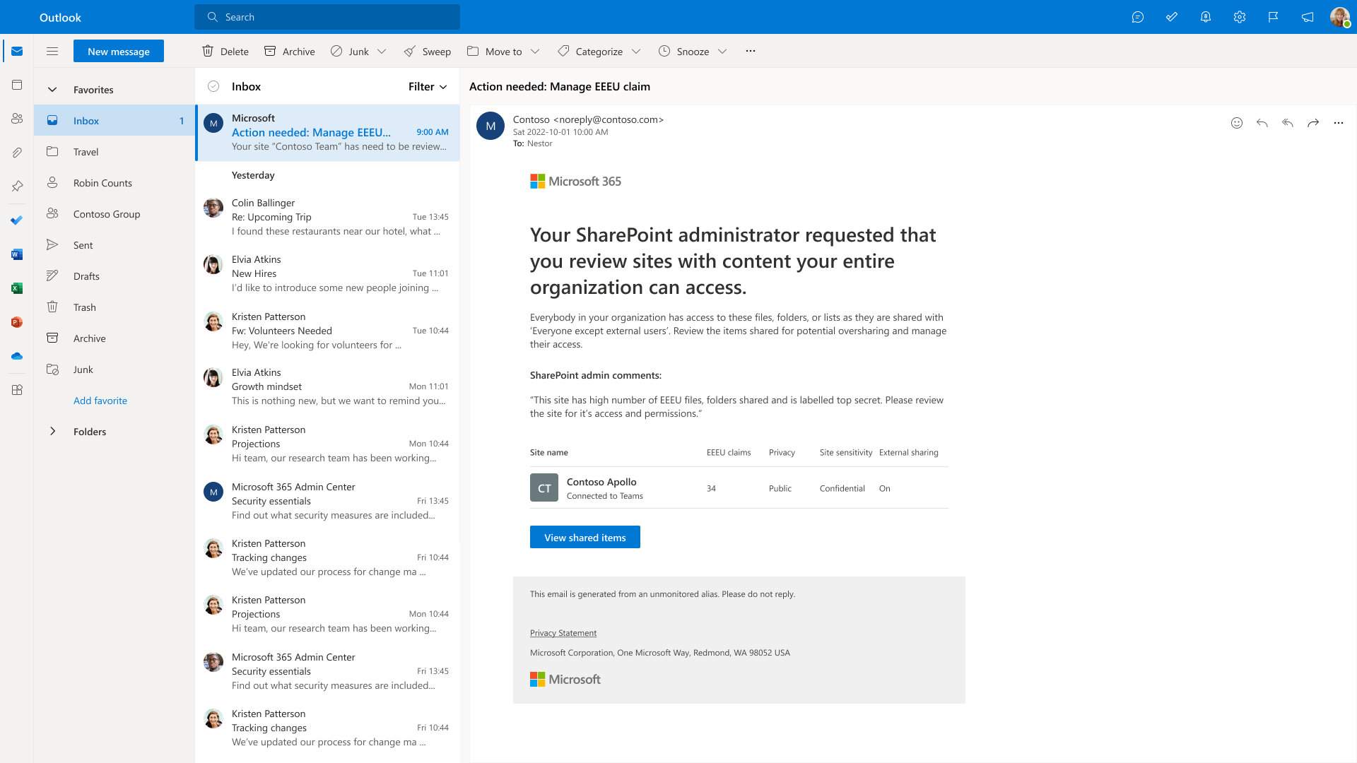 - When a review is initiated, the site owner receives an email tailored to the specific oversharing issue identified in the selected report. For example, if the review is for the "Content shared with 'Everyone except external users'" category, the email will focus only on sharing concerns related to that report.