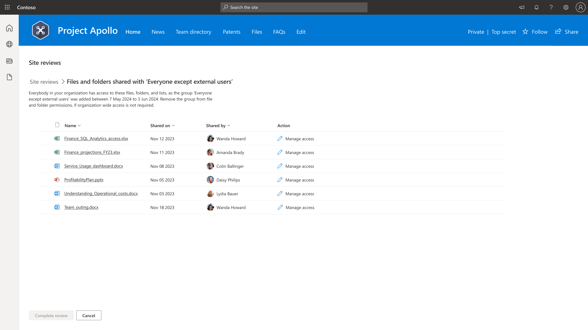 When site owners select the email, they're redirected to the site access review page, where they can see the oversharing baseline using permissions report. This report helps site owners identify items with excessive permissions and take necessary actions.