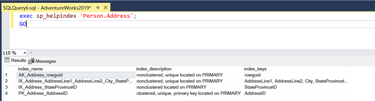 One way to check for a clustered index is by using the sp_helpindex system stored procedure. For example, we can view a summary of the indexes on the Person.Address table by executing the following statement: