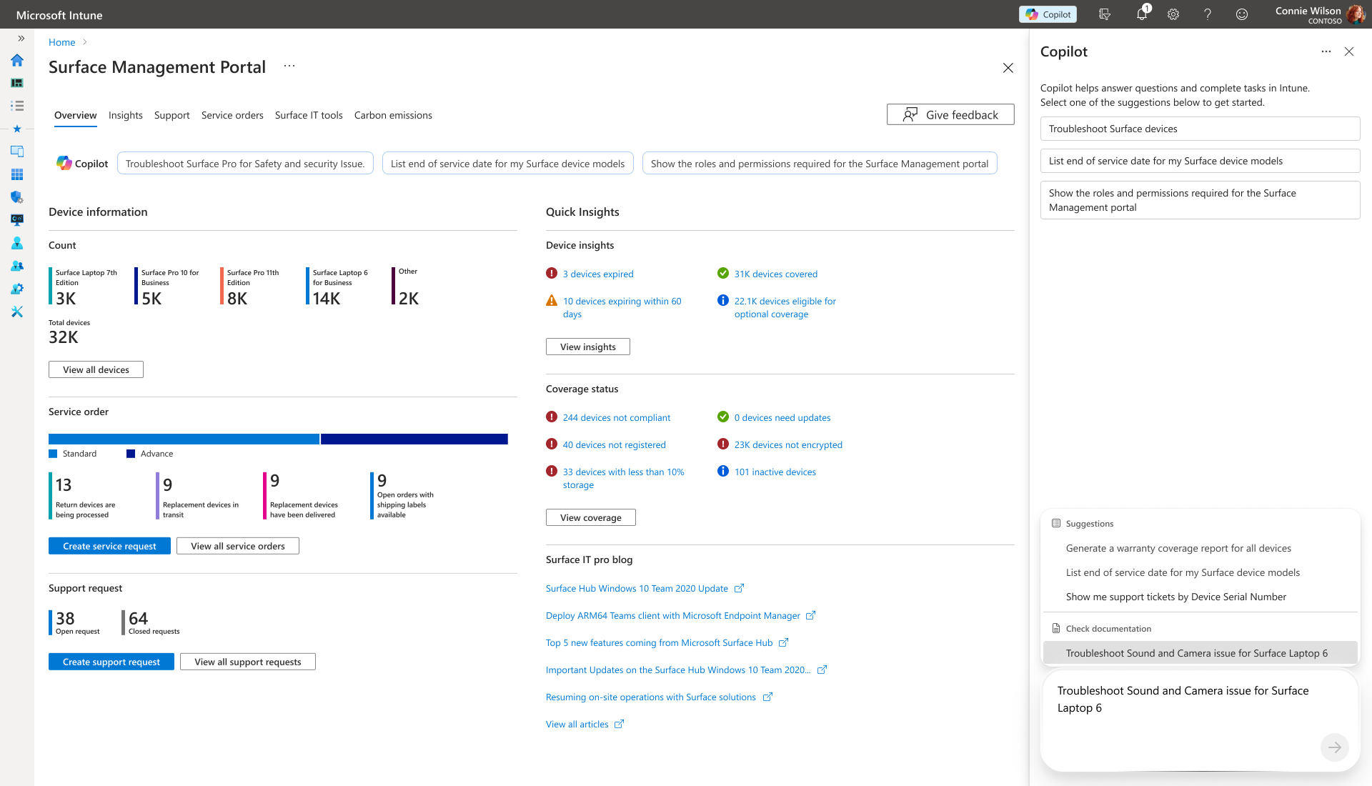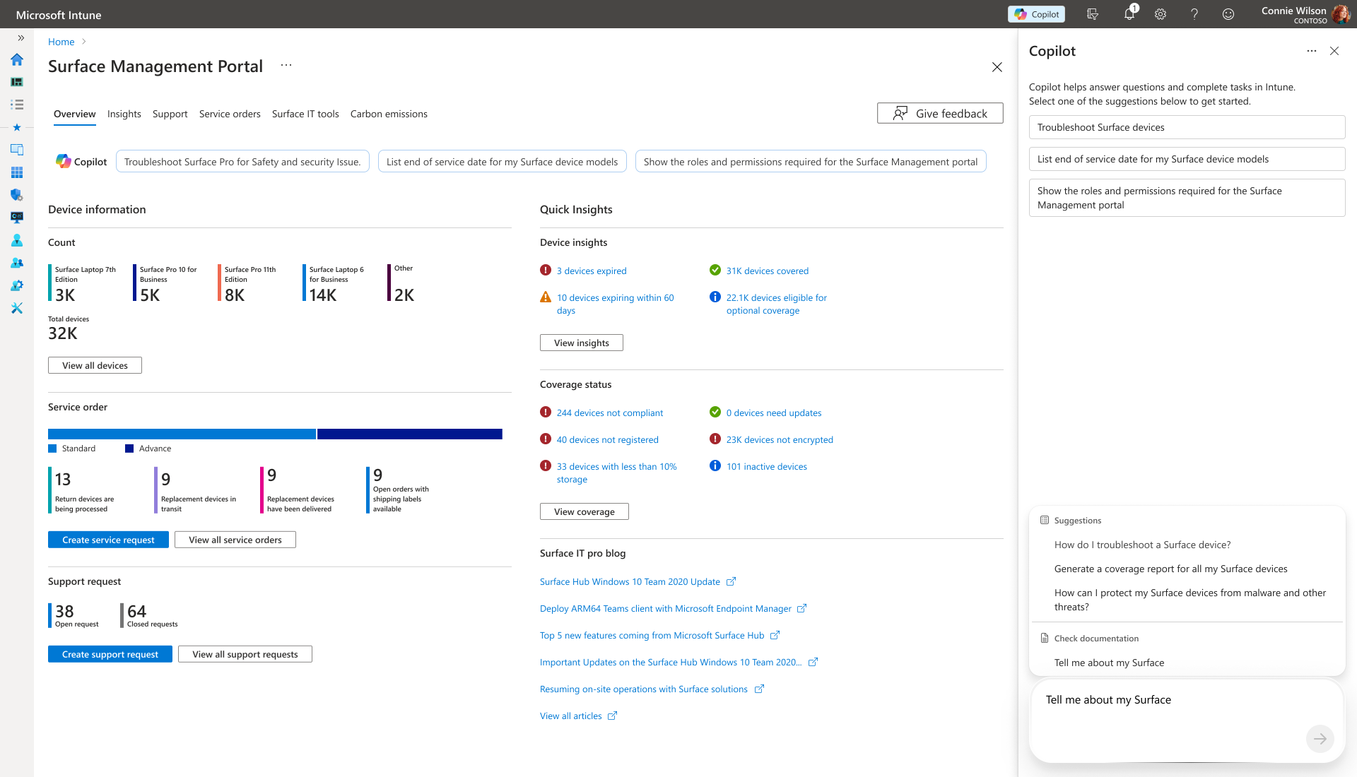 Copilot for Surface Management Portal provides visibility into your environment's applicable warranty and protection plan coverage, whichever is longer (Coverage), and end-of-servicing timelines. Additionally, it offers insights into various aspects of device management, including compliance policies, malware protection, and other threats to reduce risks.