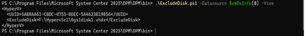 PS C:\Program Files\Microsoft System Center\DPM\DPM\bin> ./ExcludeDisk.ps1 -Datasource $vmDsInfo[8] -Remove "F:\HypervSc1\6gs1disk1.vhdx"