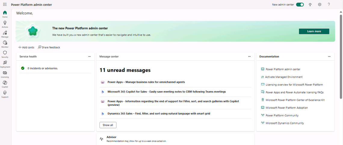 Microsoft continuously improves Power Platform experiences. Recently, a new Power Platform admin center experience was released. A toggle at the top of the admin center home page lets users switch to the new admin center.