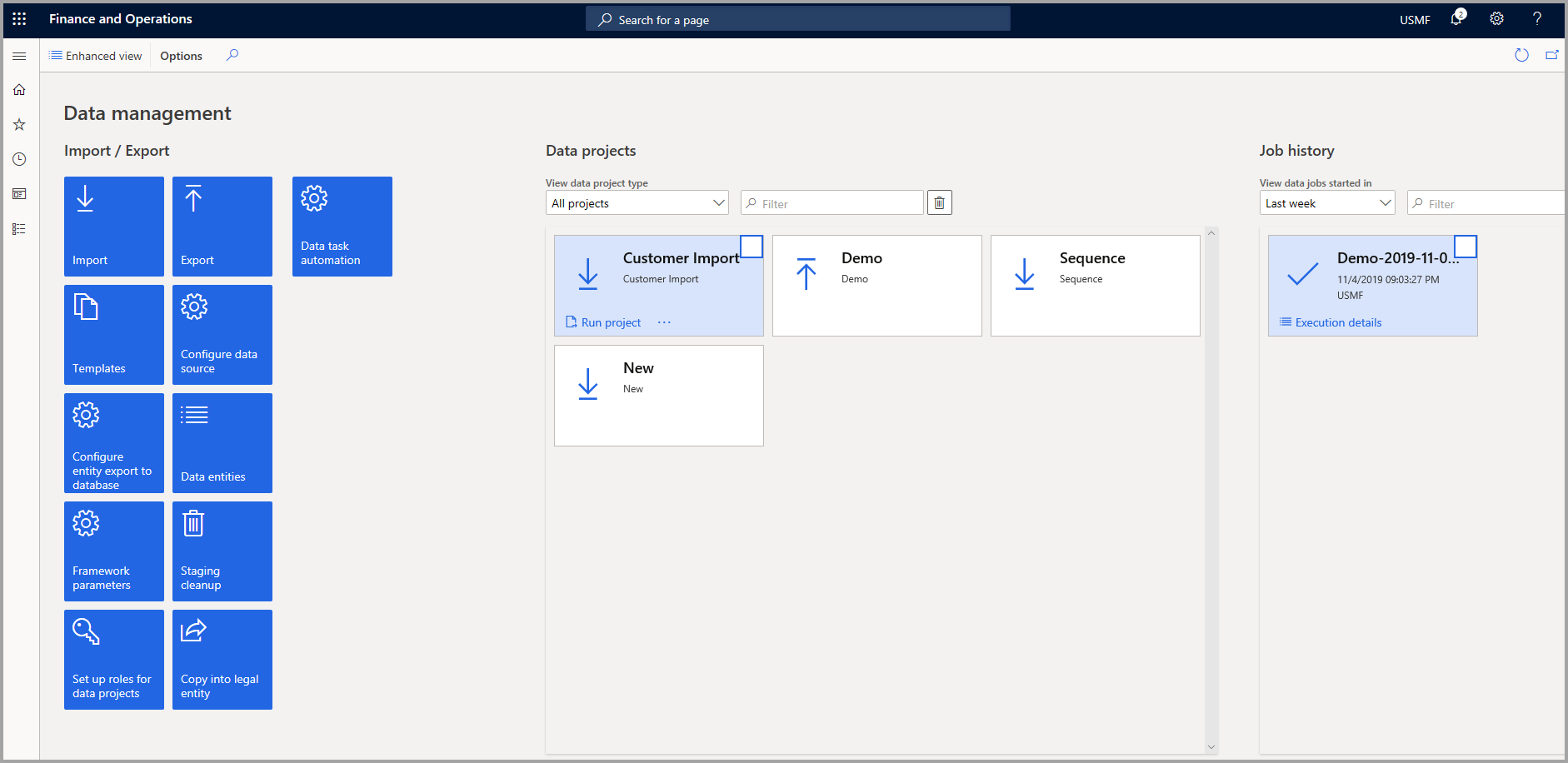 The data management tool uses data entities that represent the data of one or more tables. You can create a data project to import data into one or more entities. The data that is pushed into the entity will be pushed to the main table of finance and operations apps. You can import data through multiple file types, including .csv, .xlsx, .txt, or a package. A package holds several data import files with metadata to specify the sequence in which the import files are inserted into the system.