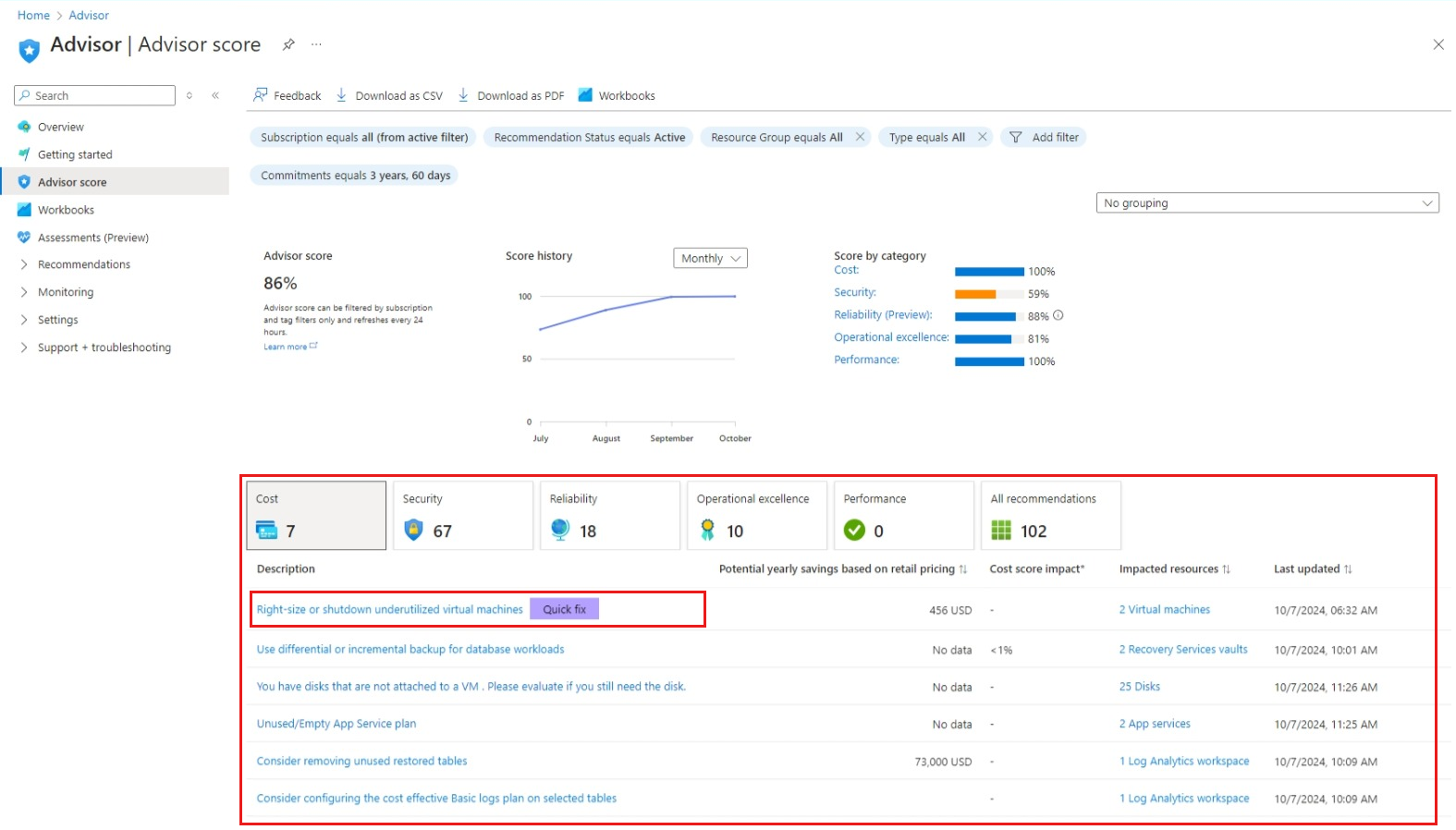 The Advisor Score in the following example differs from the Advisor Score shown in your environment on Azure Advisor.