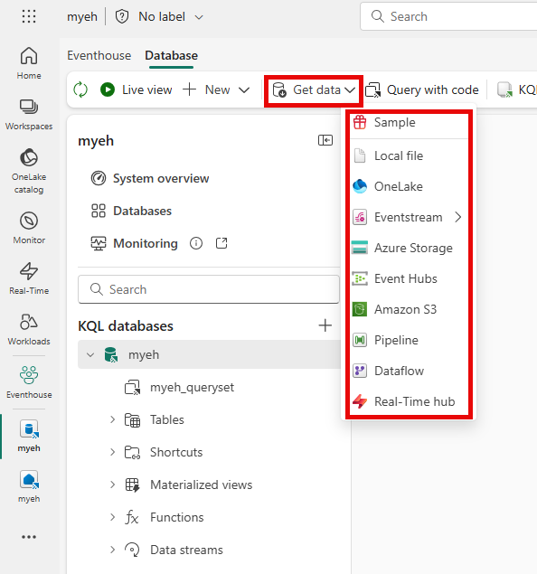 Data can also be directly ingested into a KQL (Kusto Query Language) database in an Eventhouse. Some examples of data ingestion sources include: local files, Azure storage, Amazon S3, Azure Event Hubs, OneLake, and more. Data ingestion can be configured using connectors or through the Get data option in a KQL database as shown in this image.