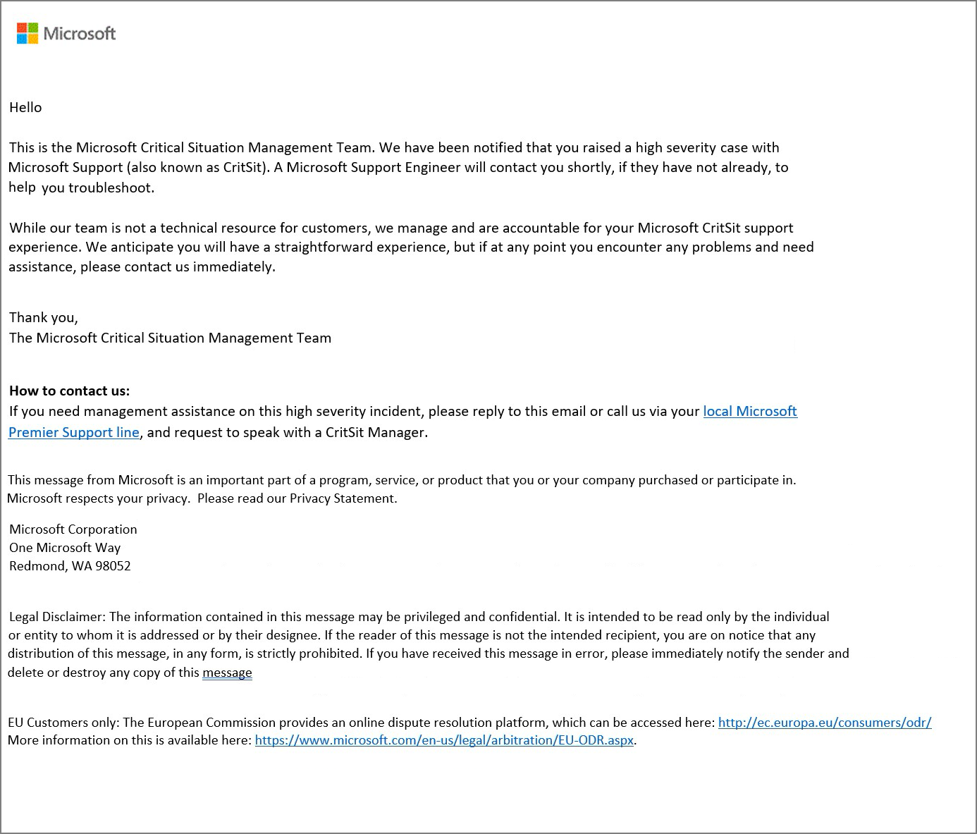 When a Severity A support case is logged with Microsoft, we notify the customer and the Support Engineer provides all ongoing support case updates.