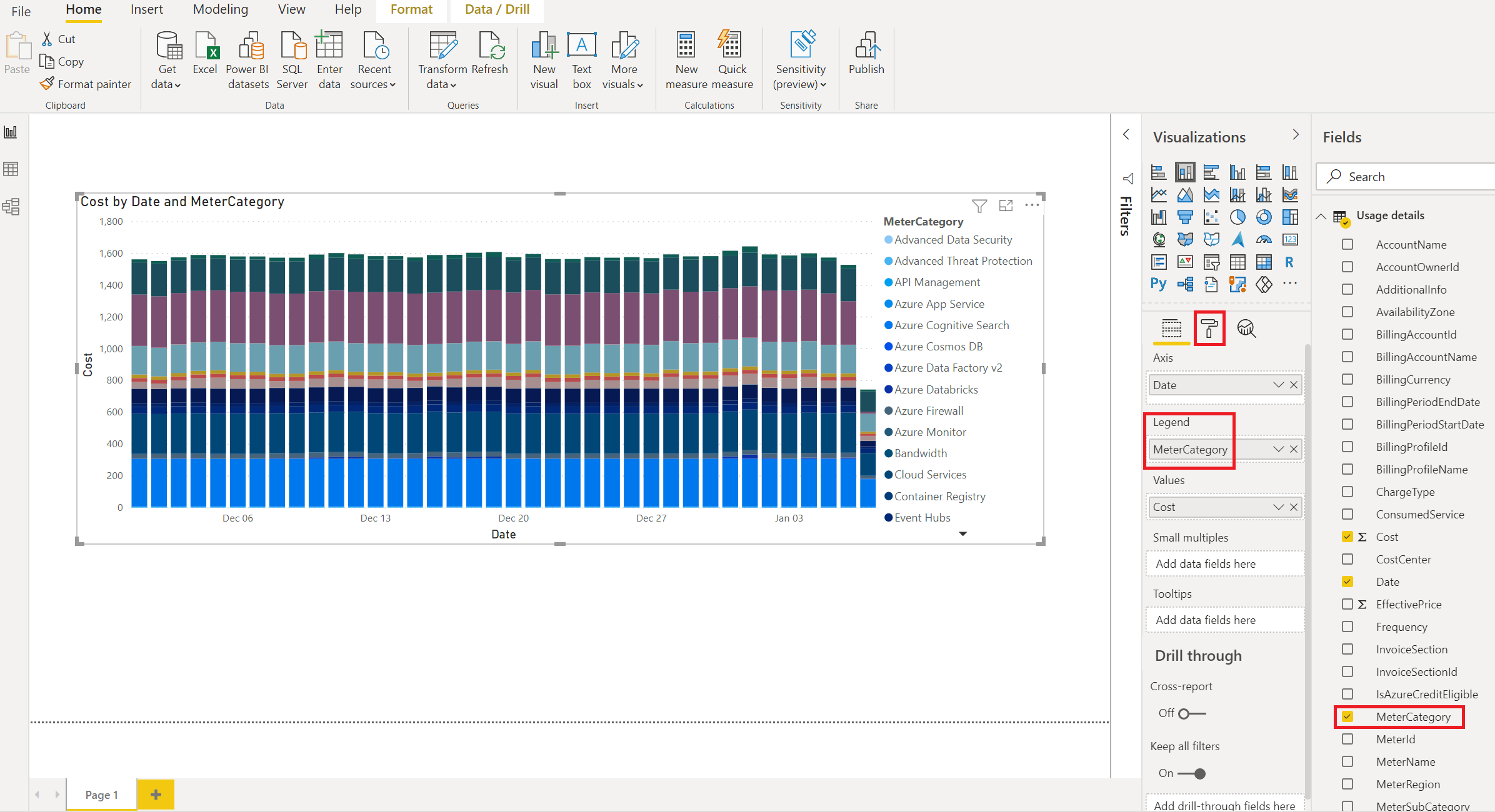 - In the Fields list, select and drag MeterCategory to the Legend area. The chart updates and shows the costs over time where each day shows the cost for each MeterCategory (Azure service).