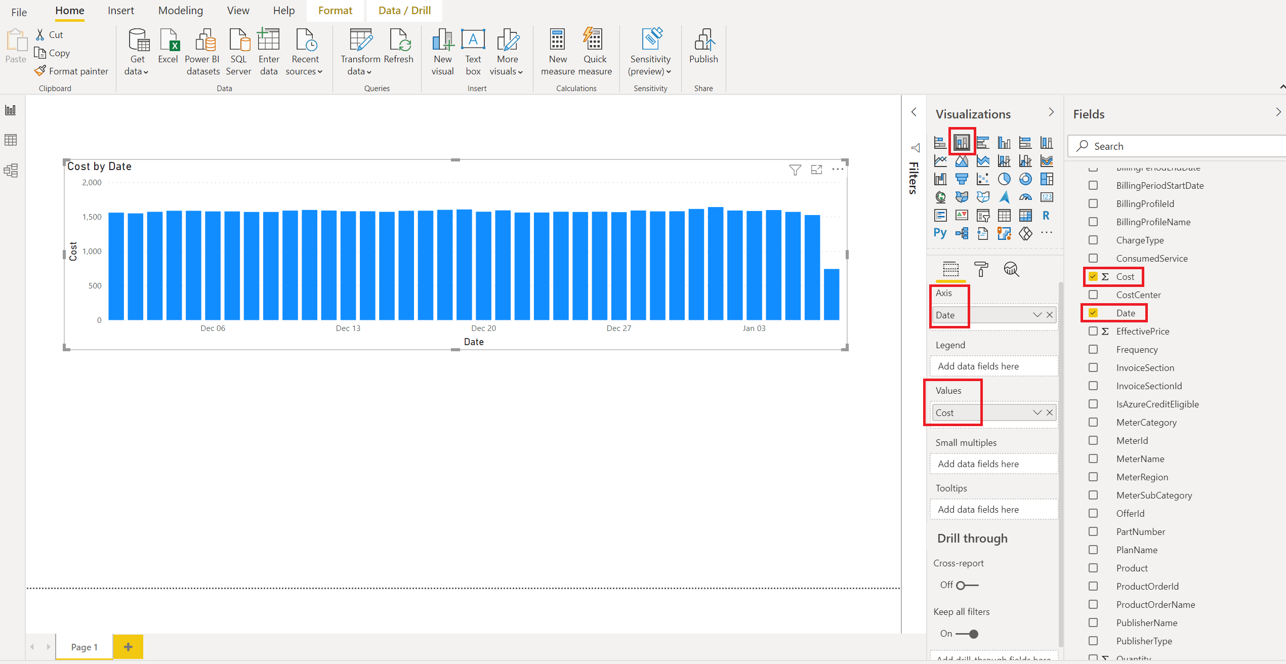 - In the Fields list, select and drag Cost to the Values area. The chart on the page is updated with data.