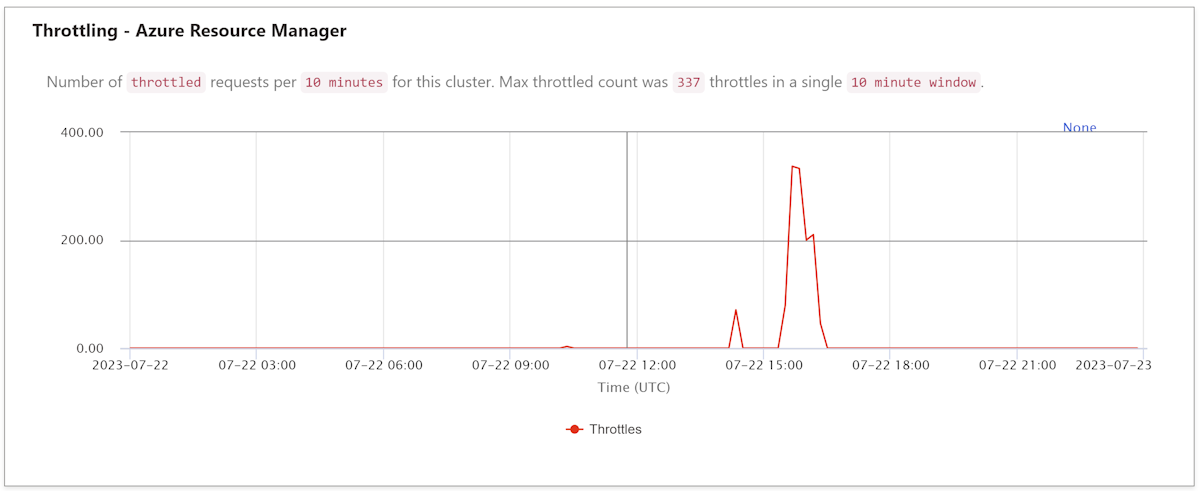 Throttling - Azure Resource Manager: This diagnostic shows the number of throttled requests in the specified time range in the AKS cluster.
