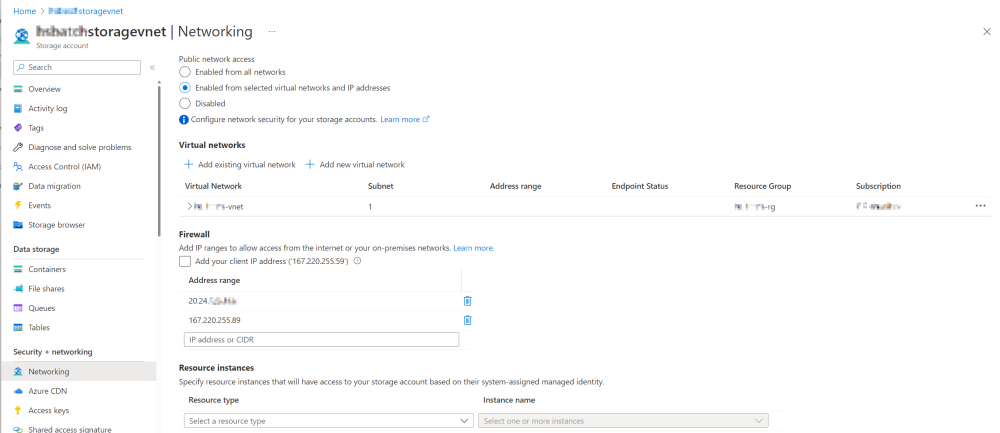Navigate to the storage account, and select Networking. In the Firewalls and virtual networks setting, select Enable from selected virtual networks and IP addresses for Public network access. Add the Batch pool's subnet in the firewall allowlist.