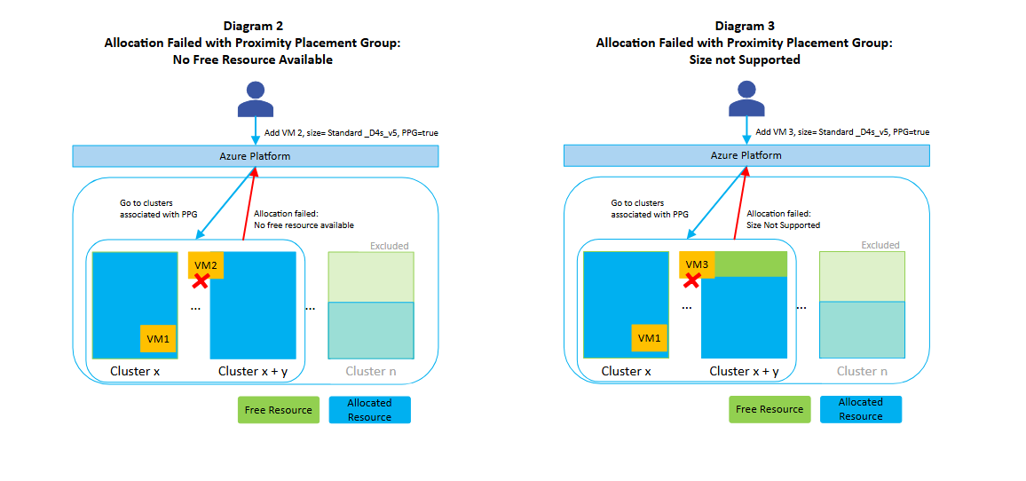 When an allocation has a large number of restrictions, there's a higher chance of failing to find free resources since the available resource pool is smaller. Furthermore, if your allocation request is restricted (for example, when using proximity placement groups but the type of resource you requested isn't supported by the set of clusters and nearby ones), your request fails even if the cluster has free resources. The following Diagram 2 illustrates the case where an allocation fails because the candidate clusters associated with the proximity placement group don't have free resources. Diagram 3 illustrates the case where an allocation fails because the candidate clusters associated with the proximity placement group don't support the requested VM size, even though the clusters have free resources.