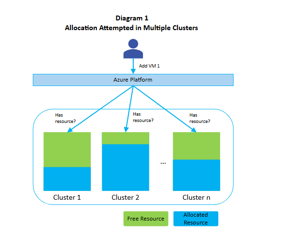 The servers in Azure datacenters are partitioned into clusters. Normally, an allocation request is attempted in multiple clusters, but it's possible that certain constraints (such as VM size, Ultra SSD, and proximity placement groups) from the allocation request force the Azure platform to attempt the request in only one cluster. The following Diagram 1 illustrates the case of a normal allocation that's attempted in multiple clusters.