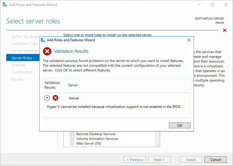 Security type: Change the security type to Standard. By default, the security type is Trusted launch virtual machines that doesn't support nested virtualization. If you set the security type to Trusted launch virtual machines, and attempt to add server roles on the Rescue VM, you'll encounter the following error message: