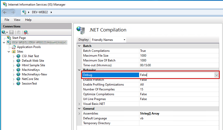Within the list of parameter values displayed in the middle pane of IIS Manager, set the value of Debug under the Behavior category to: