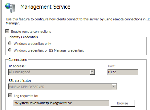 By default, the Web Management Service listens on port 8172, but this setting can be changed. The easiest way to check what port is being used is to open the Management Service pane as described earlier, and look at the IP and port information in the Connections section. If the port has been changed to something other than 8172, you need to ensure the new port is allowed through the firewall, and update the service URL in Visual Studio's publishing settings to use the new port.