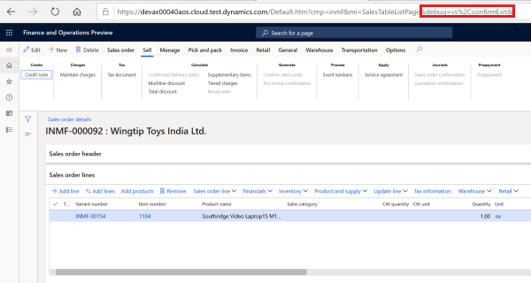 To turn on debug mode, add &debug=vs%2CconfirmExit& to the end of the URL for Microsoft Dynamics 365 Finance.