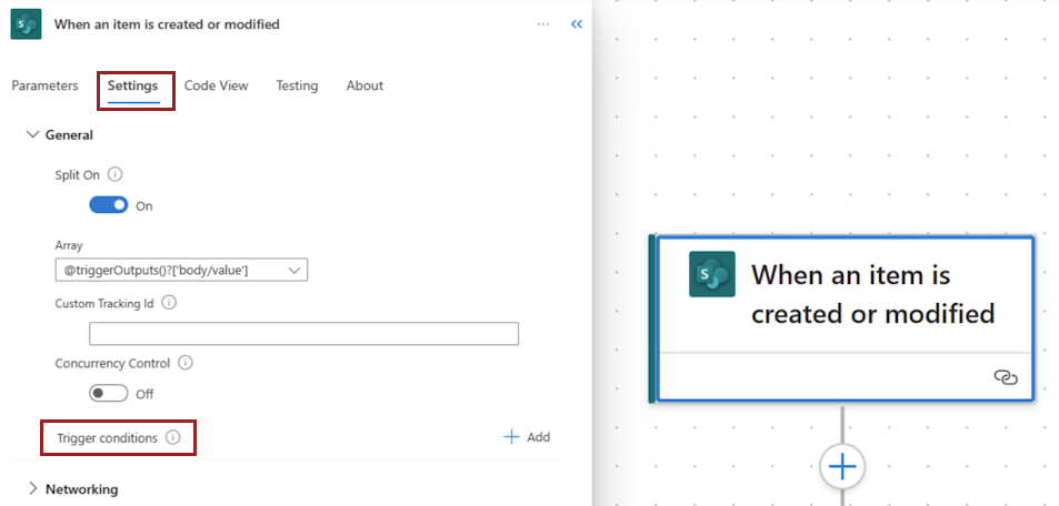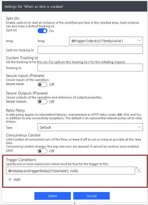 If the field is empty, there are no other customizations. The title of the card (in this case, When an item is created or modified) indicates when the trigger fires.