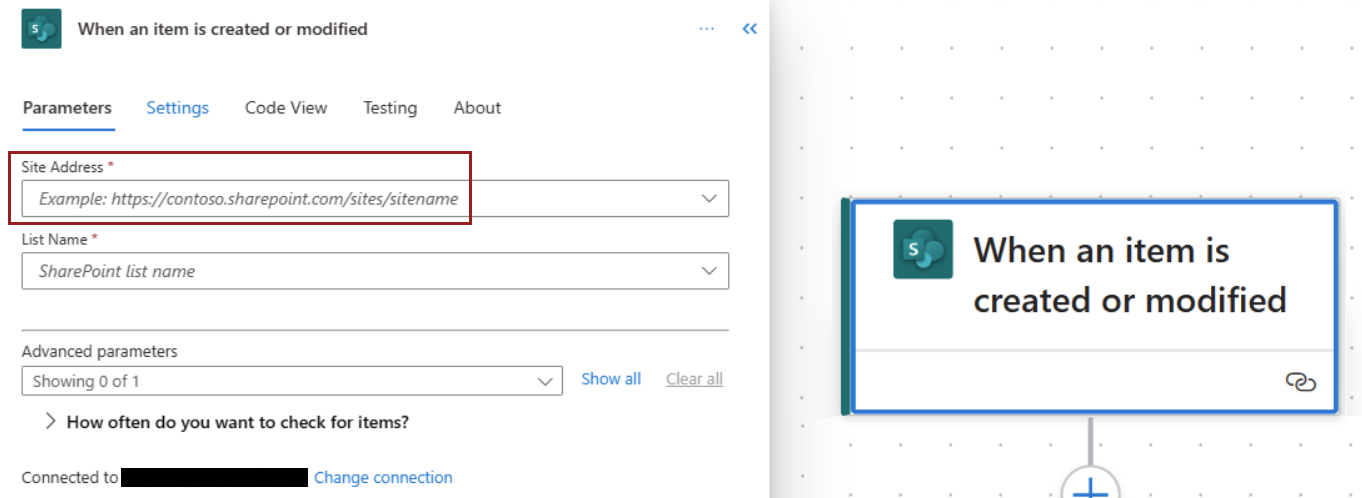 Select the first card to learn which folders, sites, mailboxes, and others items are used for the trigger in the configuration pane.