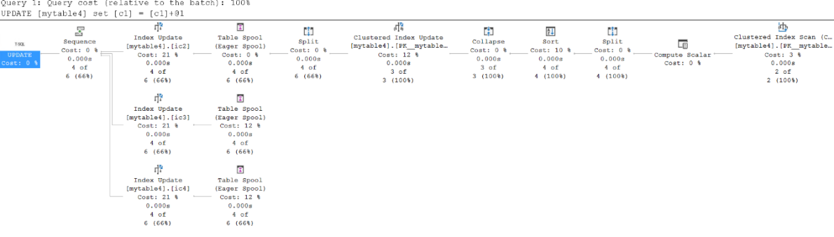 Wide plan: To optimize performance and reduce random I/O, SQL Server may choose a wide plan. It doesn't do the non-clustered indexes update along with the clustered index update together. Instead, it sorts all non-clustered index data in memory first and then updates all indexes in that order. This approach is called a wide plan (also called a Per-Index update).