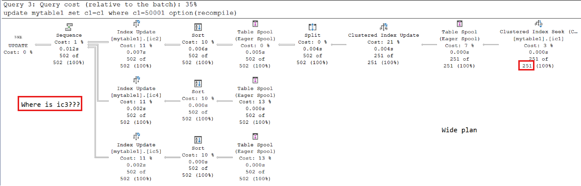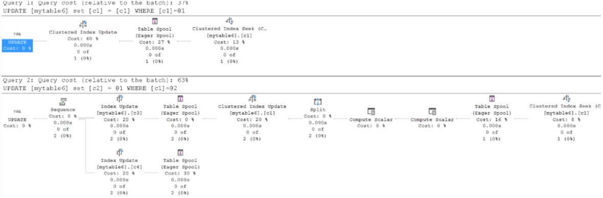 UPDATEstatements, and compare the query plans:UPDATE mytable1 SET c1=c1 WHERE c1=1 OPTION(RECOMPILE)- one row is updatedUPDATE mytable1 SET c1=c1 WHERE c1=50000 OPTION(RECOMPILE)- 250 rows are updated.UPDATE mytable1 SET c1=c1 WHERE c1=50001 OPTION(RECOMPILE)- 251 rows are updated.