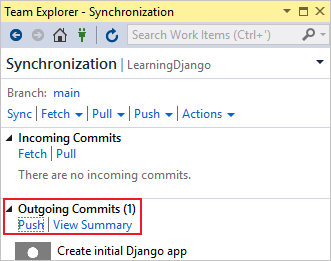 Screenshot that shows how to sync and push commits to a remote repository in Team Explorer.