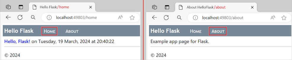 abouttemplate also refers to the base template and overrides thecontentblock:{% extends "layout.html" %} {% block content %} {{ content }} {% endblock %}Run the app again and observe the results. Use the navigation bar links to switch between app pages.