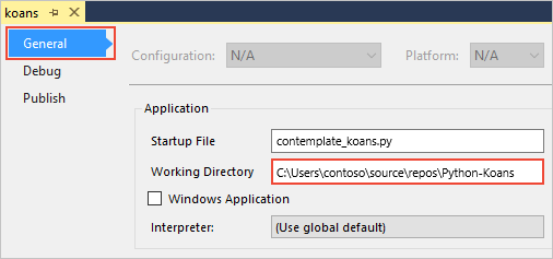 .). Notice that the Startup File has no specific folder location.The cloned program code looks for a file named koans.txt in the working directory. The code expects the directory to be the folder location where you instructed Visual Studio to store the cloned repository files. If you leave the Working Directory set to the project root (