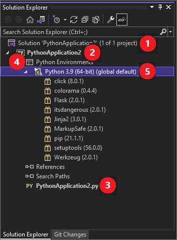 1. In Solution Explorer (1), notice the top-level item in the structure. This item is your Visual Studio solution. By default, your solution name is the same as your project.