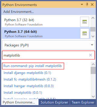 2. In the Search field, enter matplotlib. In the results list, select the Run command: pip install matplotlib option.