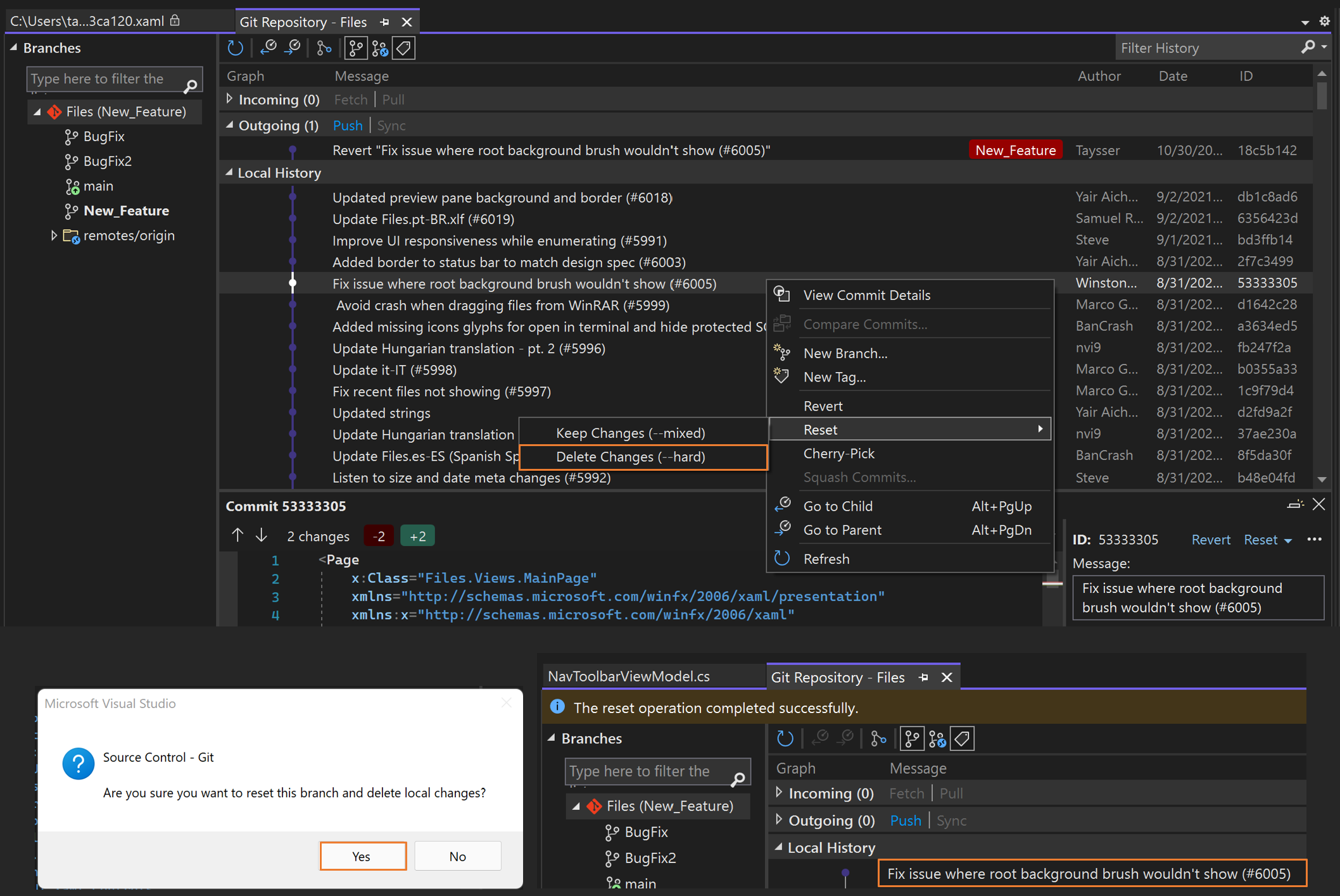 The --hard part of the command tells Git to reset the files to the state of the previous commit and discard any staged changes. To do the same in Visual Studio, right-click the commit that you want to reset your branch to, and then select Reset > Delete Changes (--hard).