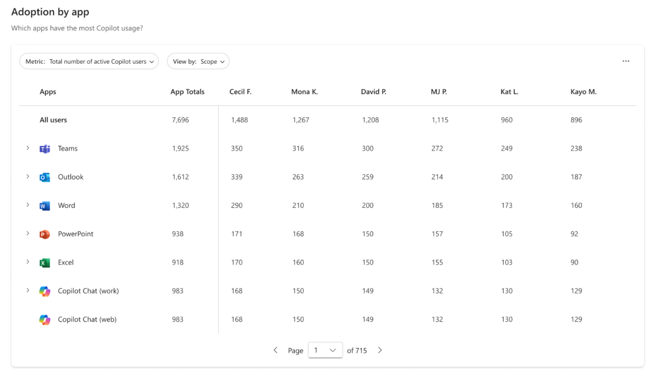 The app total refers to the total number of unique users who are active on any Copilot feature for that app, and the list of features below the app might not include every feature.