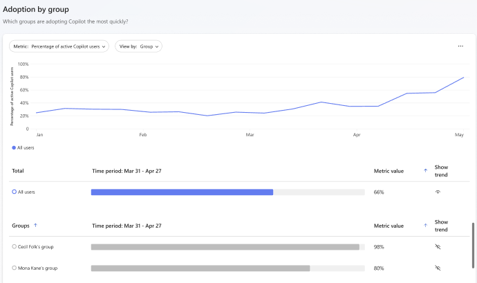 After your admin deploys Copilot in your organization, this page allows you to track user adoption trends per Microsoft 365 app and Copilot feature. Information is consistent with data points displayed in the Microsoft 365 admin center including the Copilot Usage report and Microsoft Adoption Score.