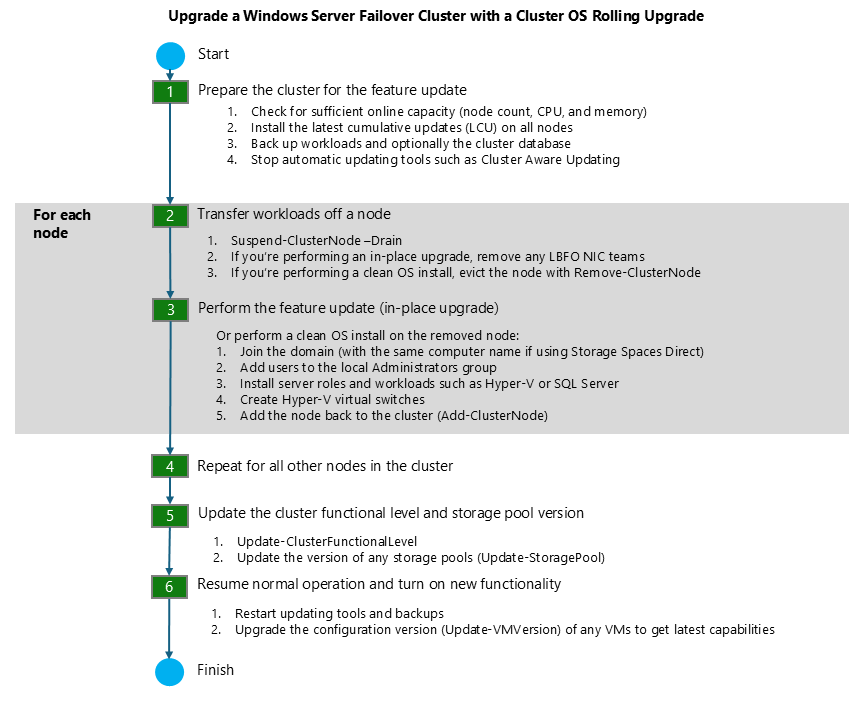This article describes how to manually install a feature update on a Windows Server failover cluster without stopping workloads. The process upgrades one node at a time in a rolling upgrade and is often called a Rolling OS Cluster Upgrade.