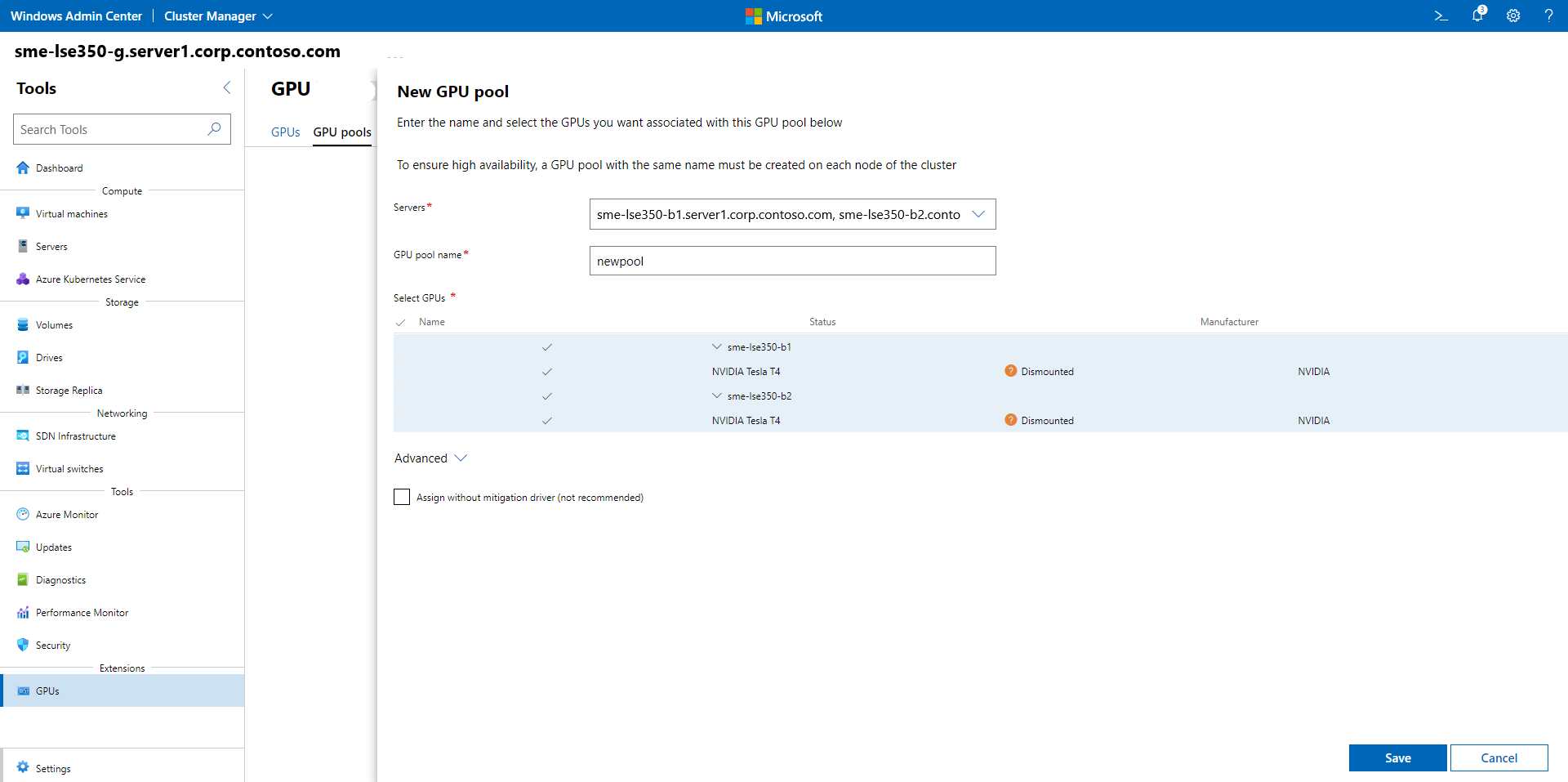 Screenshot of the Create GPU pools page in Windows Admin Center.