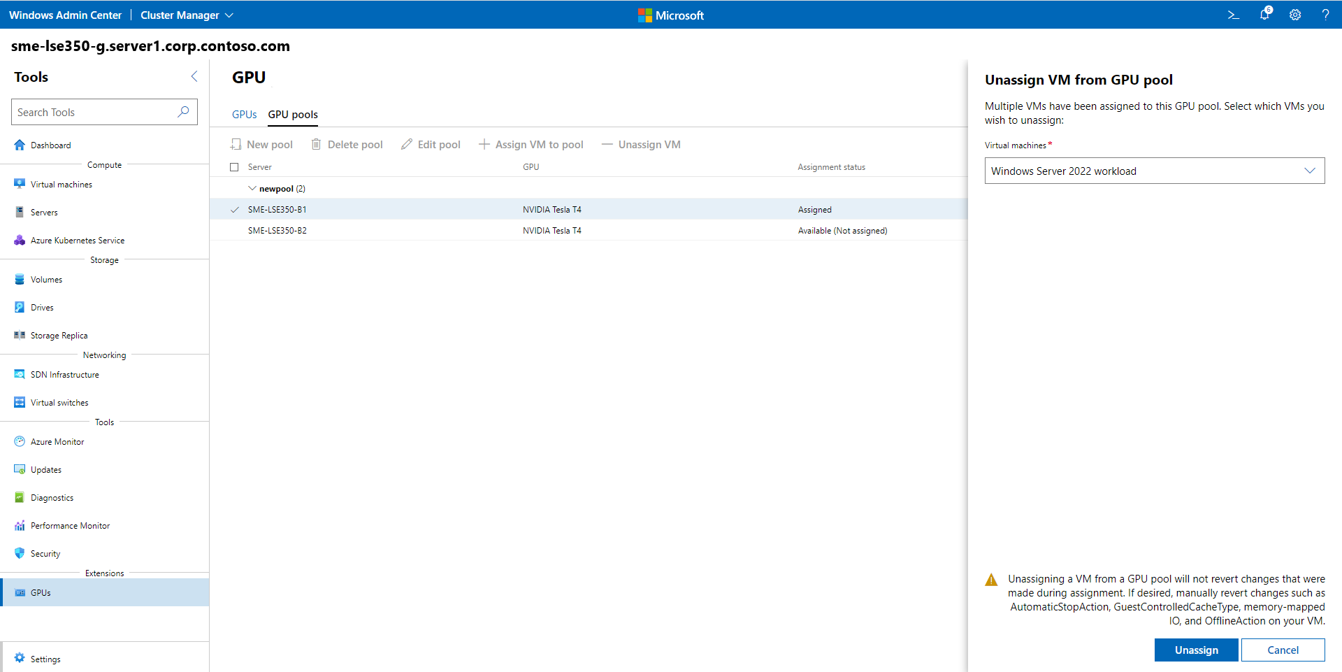 2. On the Unassign VM from GPU pool page, in the Virtual machines list box, specify the name of the VM, and then select Unassign.