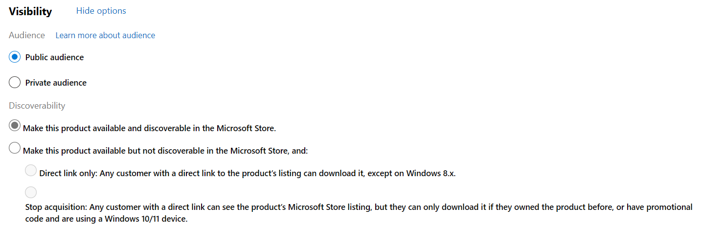 By default, your app’s Store listing will be visible to a Public audience. This is appropriate for most submissions, unless you want to limit who can see your app’s listing to specific people. You can also use the options in the Discoverability section to restrict discoverability if you’d like.