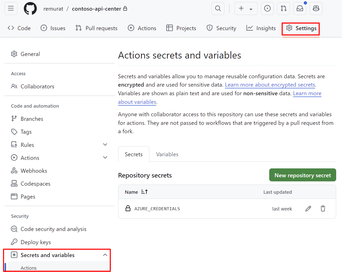 AZURE_CREDENTIALS. Seleccione Add secret (Agregar secreto).El secreto aparece en Secretos del repositorio.