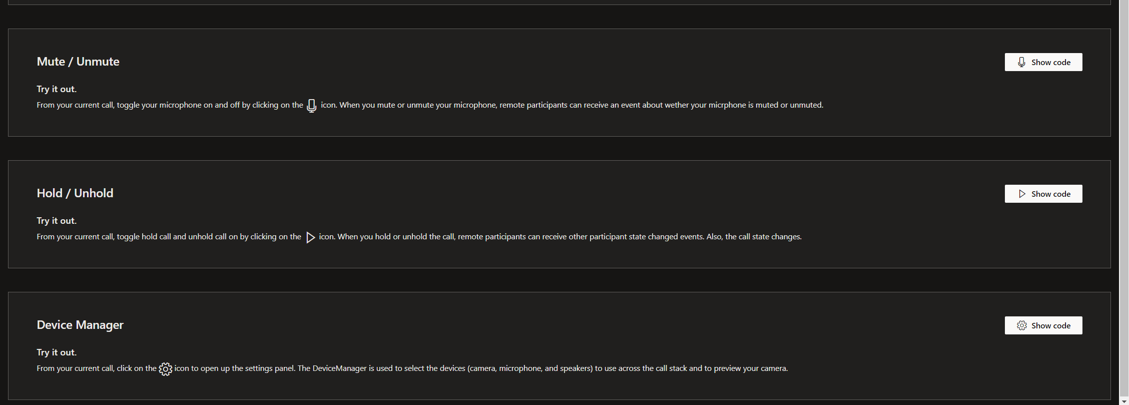 Haga clic en el botón "Show code" (Mostrar código) para ver el código de ejemplo para realizar llamadas, recibir llamadas y unirse a llamadas grupales.