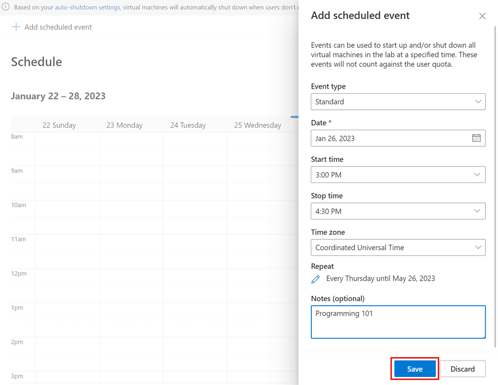 En lugar de que cada usuario del laboratorio inicie su máquina virtual de laboratorio de forma manual, opcionalmente puede crear una programación de laboratorio para iniciar y detener automáticamente las máquinas virtuales de laboratorio de acuerdo con su calendario de entrenamiento. Azure Lab Services admite eventos únicos o programaciones periódicas.