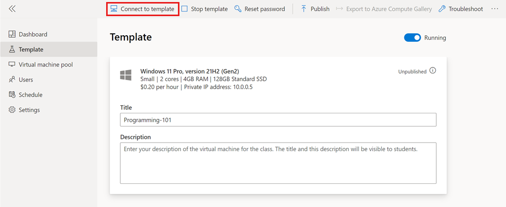 Captura de pantalla que muestra la página Plantilla de un laboratorio, resaltando Conectar a la plantilla.