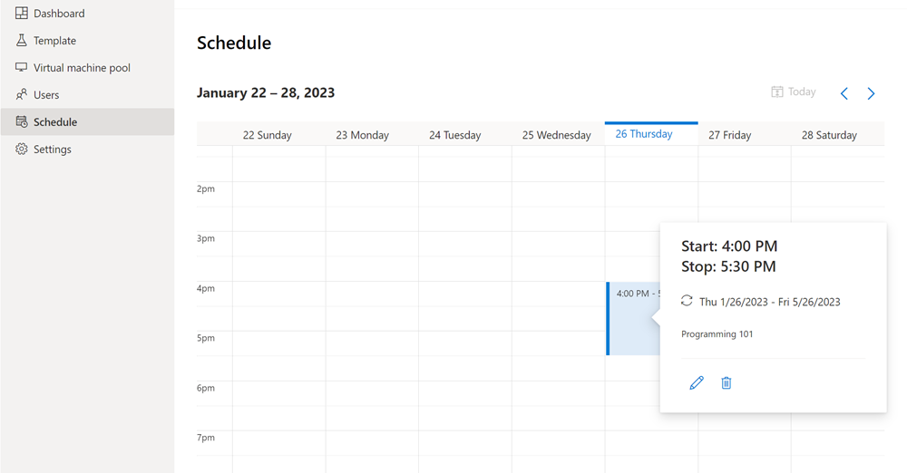Captura de pantalla de la página Programación de Azure Lab Services. En el calendario se muestra una programación repetida, de lunes a viernes.