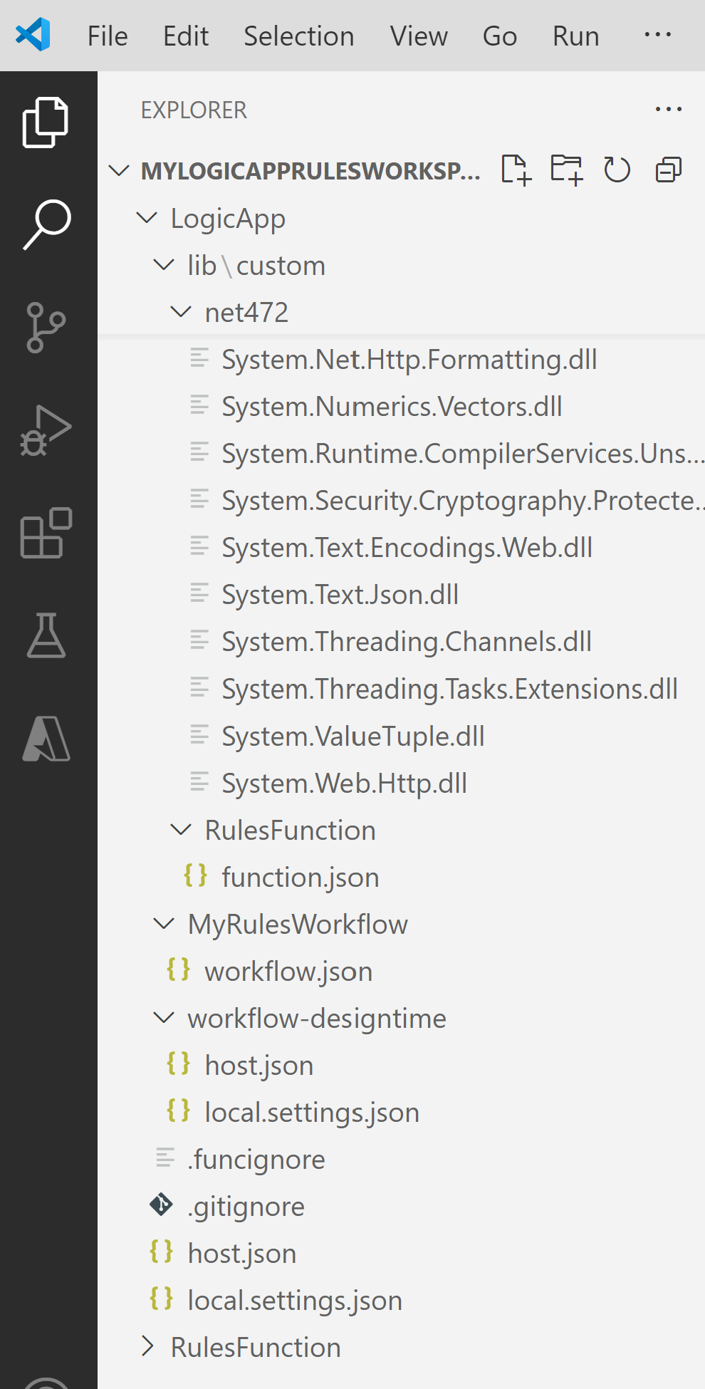 En el área de trabajo, expanda las carpetas siguientes: LogicApp>lib\custom>net472. Confirme que la subcarpeta denominada net472 contiene los varios ensamblados necesarios para ejecutar el código, incluido un archivo denominado <nombre-de-la-función>.dll.