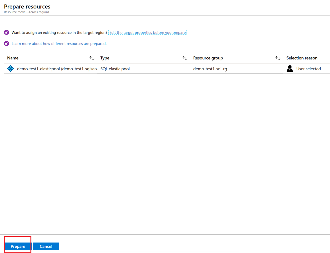 En Entre regiones, seleccione la base de datos (demo-test2-SQLdb en este tutorial) y seleccione Preparar.