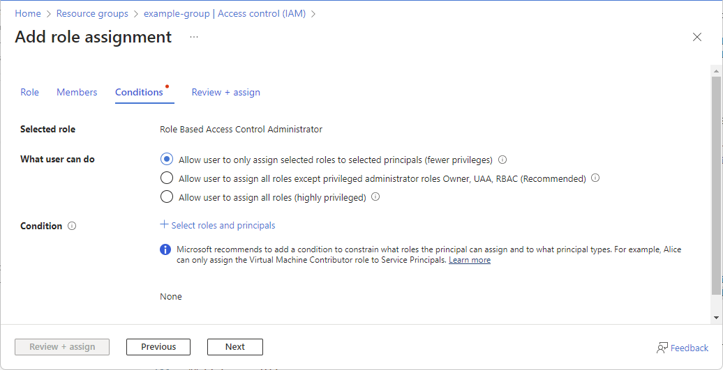 En la pestaña Condiciones en ¿Qué puede hacer el usuario?, seleccione la opción Permitir que el usuario asigne solo roles seleccionados a entidades de seguridad seleccionadas (menos privilegios).