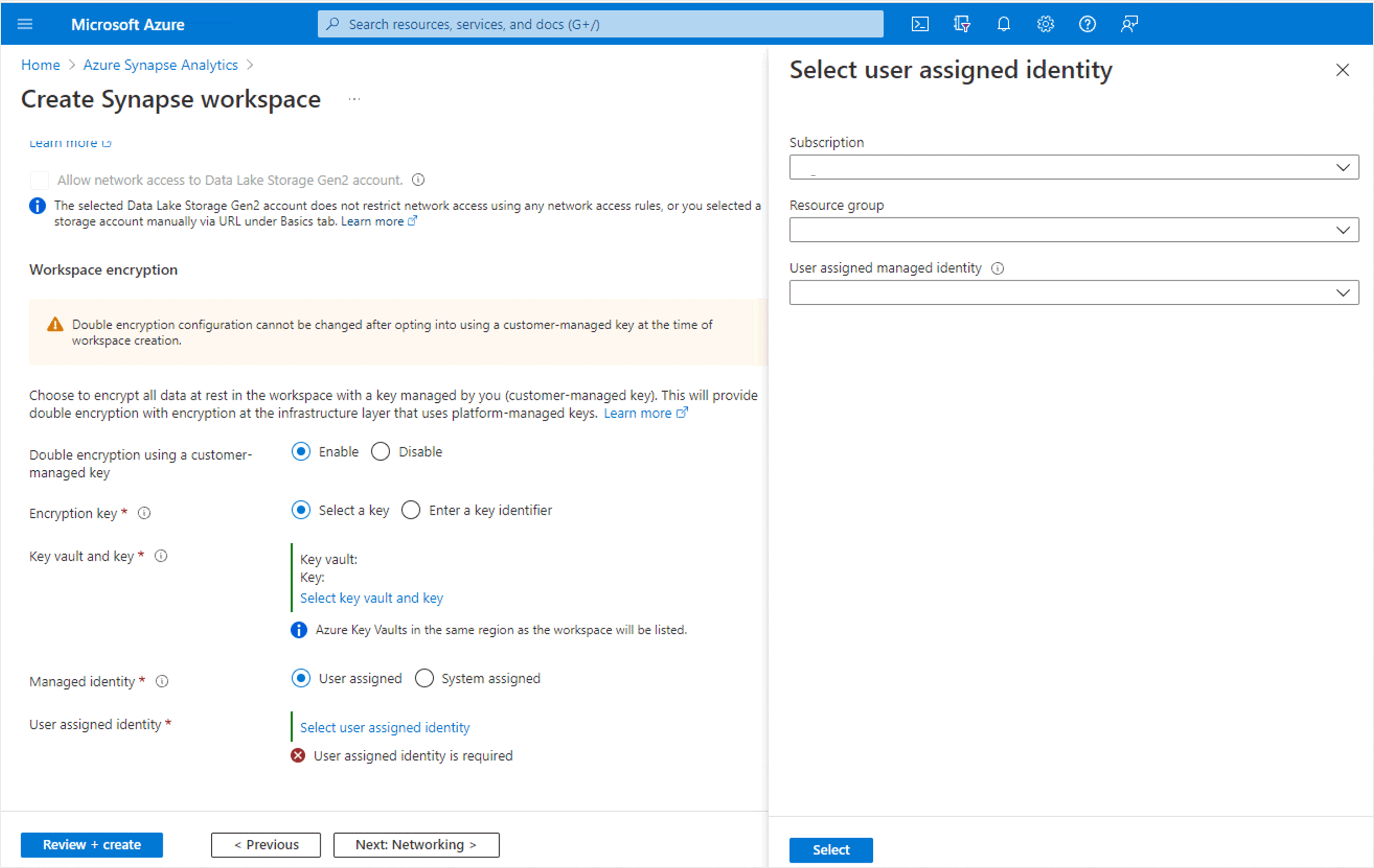 Las áreas de trabajo se pueden configurar para habilitar el cifrado doble con una clave administrada por el cliente en el momento de su creación. Habilite el doble cifrado mediante una clave administrada por el cliente en la pestaña "Seguridad" al crear el área de trabajo. Puede elegir especificar el URI de un identificador de clave o seleccionarlo en una lista de almacenes de claves en la misma región que el área de trabajo. La propia instancia de Key Vault debe tener habilitada la protección de purga.