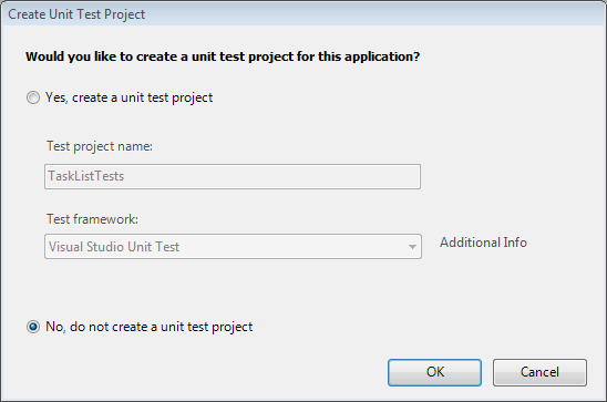 Cada vez que cree un nuevo proyecto de aplicación web MVC, Visual Studio le pedirá que cree un proyecto de prueba unitaria diferente. Aparece el cuadro de diálogo de la figura 2. Dado que no vamos a crear pruebas en este tutorial por limitaciones de tiempo (y, sí, deberíamos sentirnos algo culpable por ello), seleccione la opción No y haga clic en el botón Aceptar.