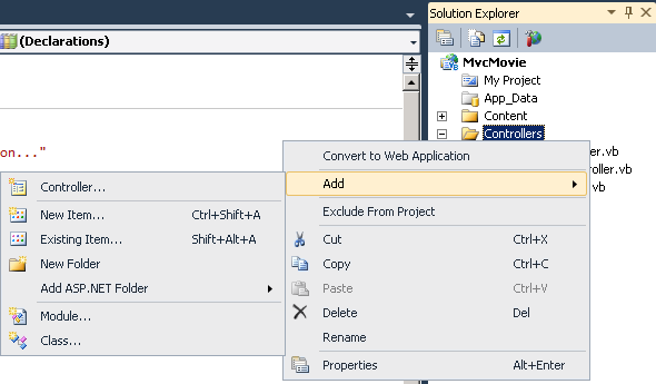 Cree un controlador haciendo clic con el botón derecho en la carpeta Controladores de Explorador de soluciones y, a continuación, seleccione Agregar controlador.
